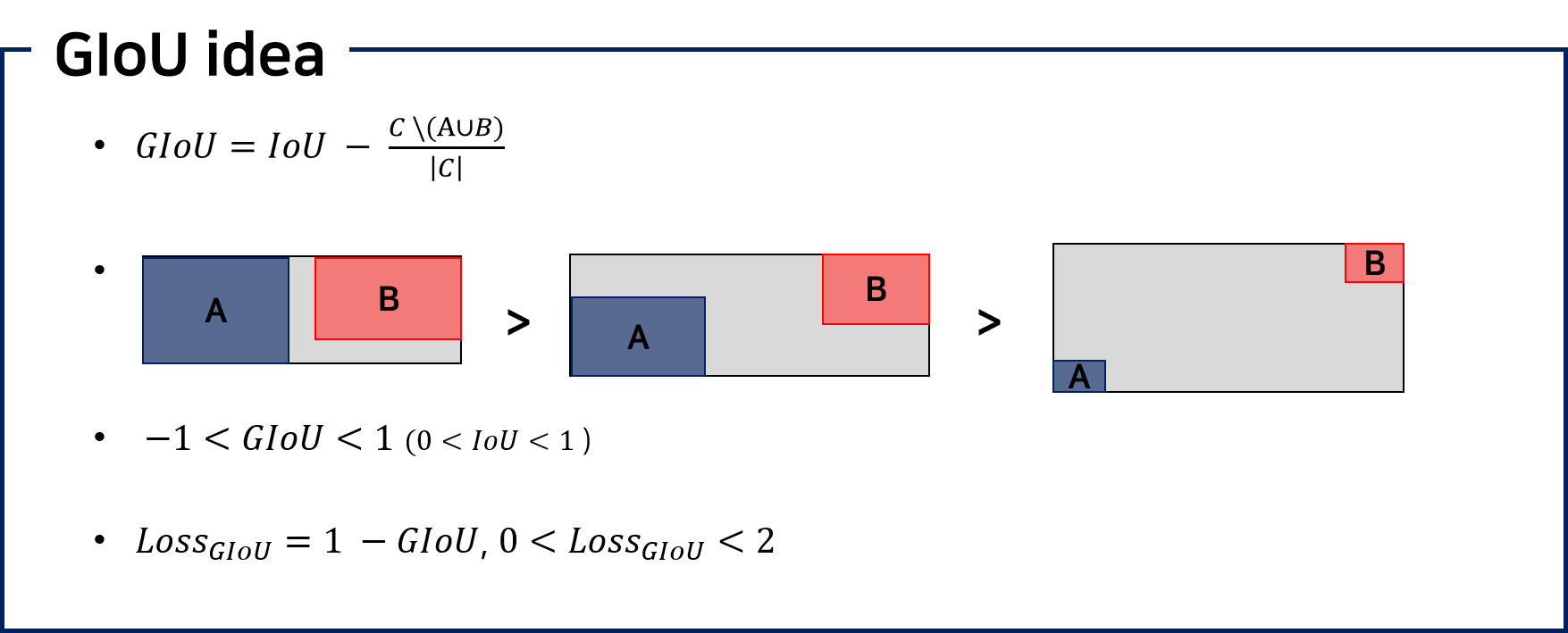 A와 B 영역을 모두 감쌀 수 있는 최소 영역인 C를 만들고, C를 활용하여 A와 B가 얼마나 떨어져 있는지에 대해 반영할 수 있는 추가 항을 도입한다. 처음의 공식을 보면 기존 IoU에서 전체에서 회색 공간이 차지하는 비율을 뺀 값을 GIoU로 설정한 것을 볼 수 있다. 이 때문에 회색 공간의 비율이 IoU보다 크게되면 GIoU는 음수를 가질 수 있다는 특징이 있다.