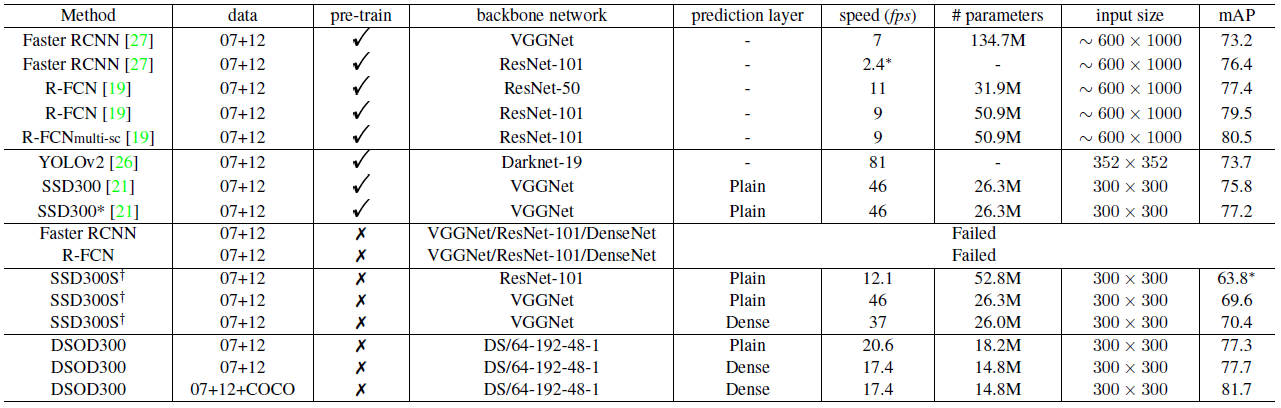 pre-trained 된 ImageNet에서 하나의 light Backbone 네트워크 DS/64-12-16-1을 훈련 시켰는데, 검증 세트에서 66.8% top-1 정확도와 87.8 % top-5 정확도를 얻을 수 있었으며(VGG-16보다 약간 나쁨), “07 + 12” train val 세트에서 전체 프레임워크를 fine-tuning한 네트워크는 VOC 2007 테스트 세트에서 70.3 % mAP를 달성하였다. 이에 반해 training-from-scratch 솔루션은 70.7 %의 정확도를 달성하며 약간 더 좋은 결과를 보였다.