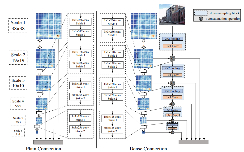 Dense 구조는 Backbone의 sub-network 뿐만 아니라 front-end 멀티 스케일 Prediction layer에서도 활용된다. 위의 그림은 front-end prediction layer의 구조 비교를 보여주며, 여기서 multi-resolution prediction-map의 융합 및 재사용은 모델 매개변수를 줄이면서 최종 정확도를 유지하거나 개선하는데 도움이 된다.