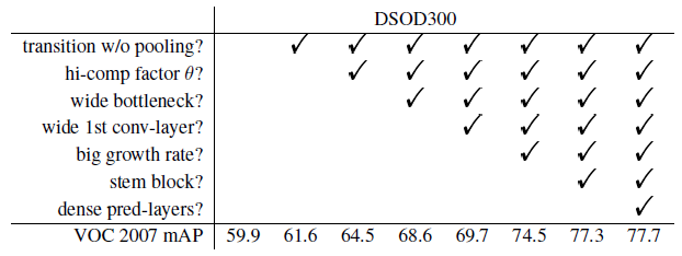 제안된 레이어가 없는 경우(오진 3개의 Dense 블록만 존재)와 있는 경우(DSOD에서의 4개의 Dense 블록이 존재)를 비교하였다. Backbone 네트워크는 DS/32-12-16-0.5이며, 결과는 위의 표에 나와 있다. 풀링 계층이없는 Transition 블록이 있는 네트워크 구조는 1.7 %의 성능 향상을 가져와, 이 계층의 효율성을 입증하였다.